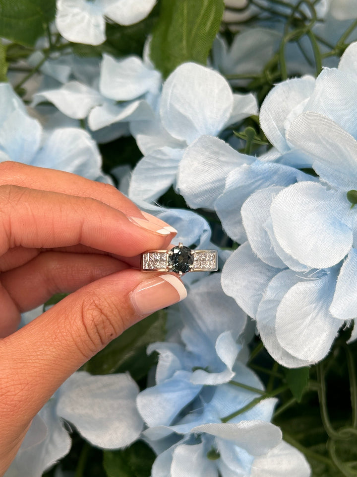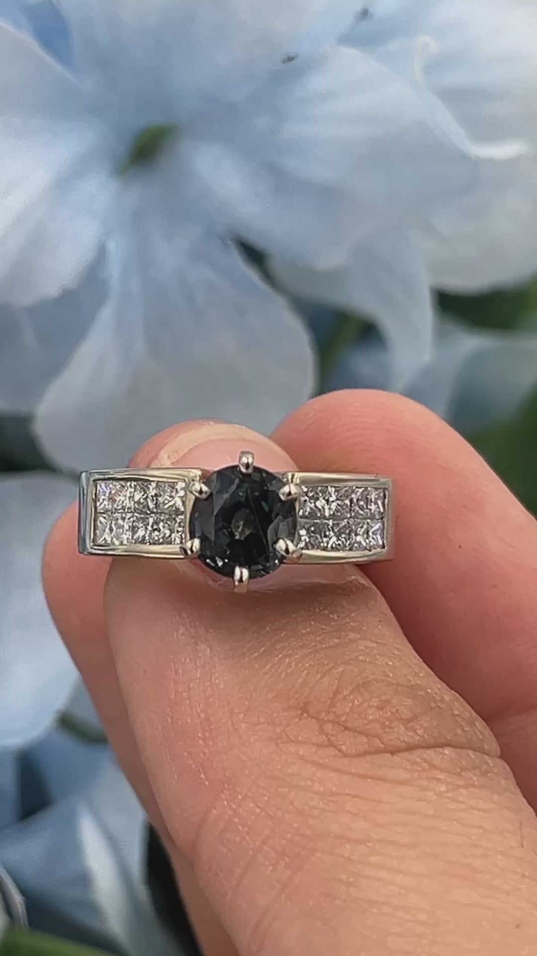 At the heart of this exquisite ring lies a rare 2.05 carat no heat treatment and color change sapphire, renowned for its unparalleled beauty and rarity. Accompanied by a prestigious GIA report, this sapphire captivates with its mesmerizing interplay of hues, transitioning seamlessly from a lush greenish blue to a delicate grayish violet, creating a spectacle of color that enchants the beholder.