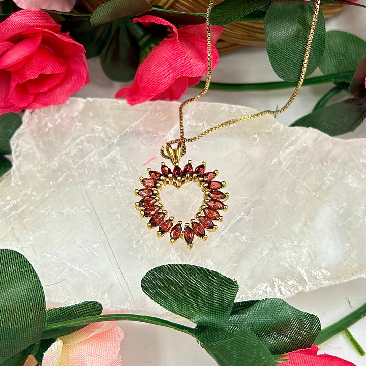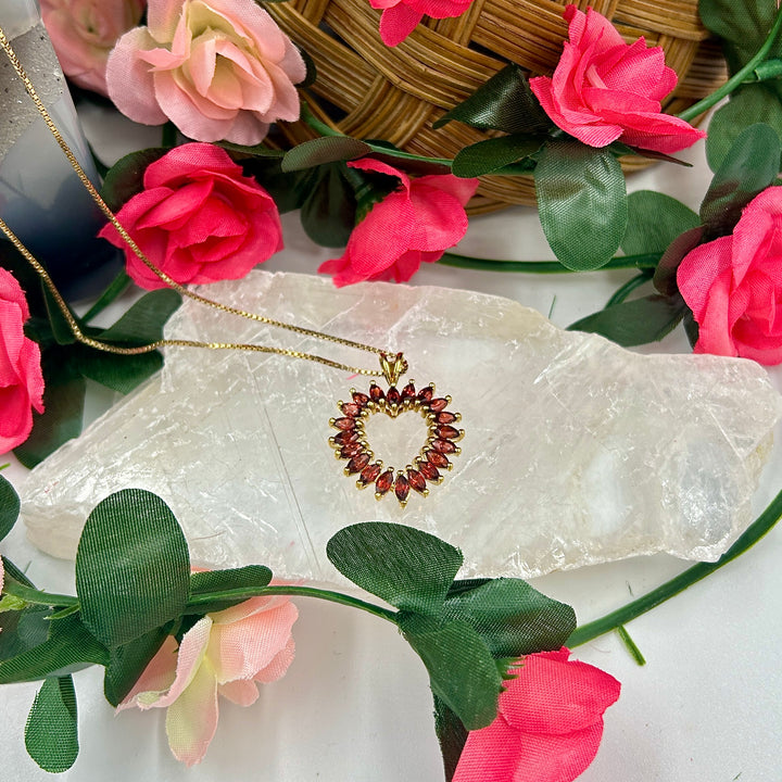 The deep red garnets are the highlight of this necklace, symbolizing love and passion. Each gemstone is meticulously set to maximize its brilliance and sparkle, creating a breathtaking focal point. The heart-shaped pendant, combined with the elegant gold-plated sterling silver chain, offers a sophisticated yet heartfelt piece perfect for any occasion.