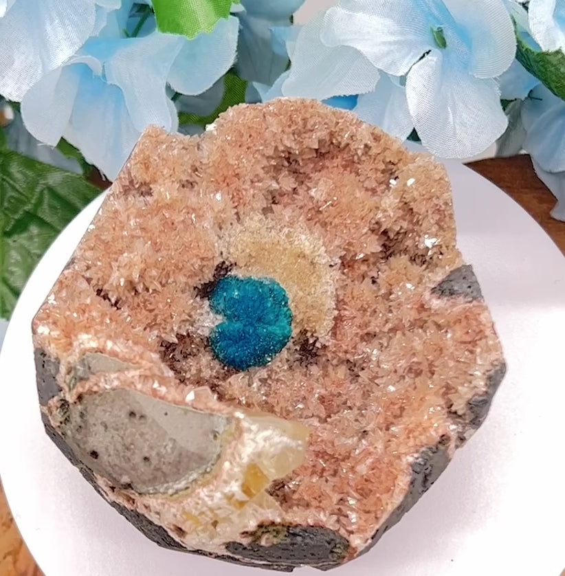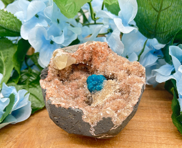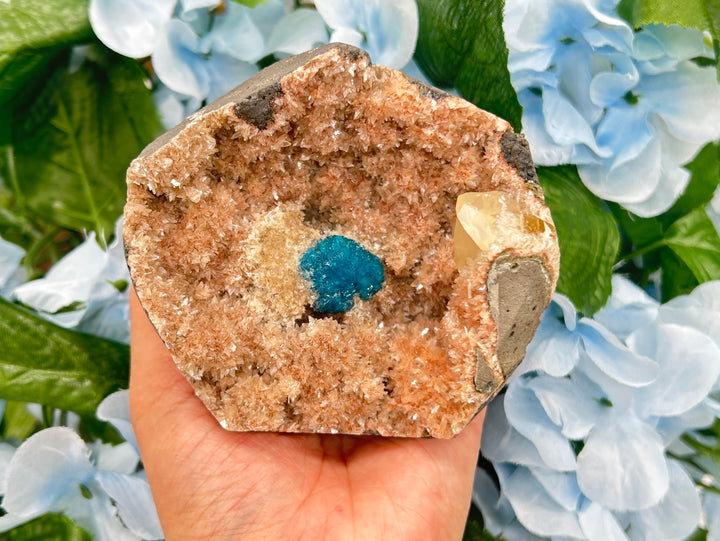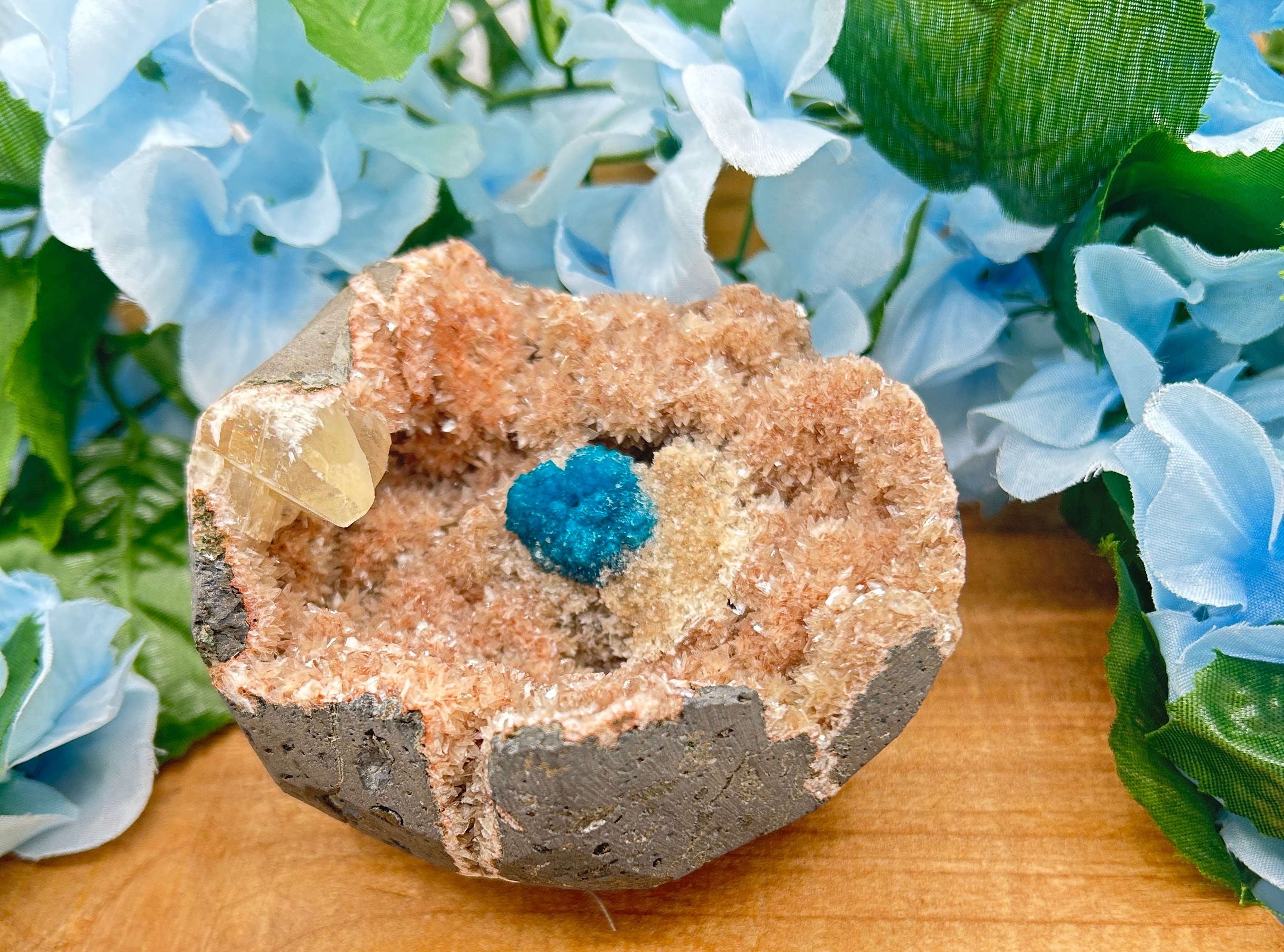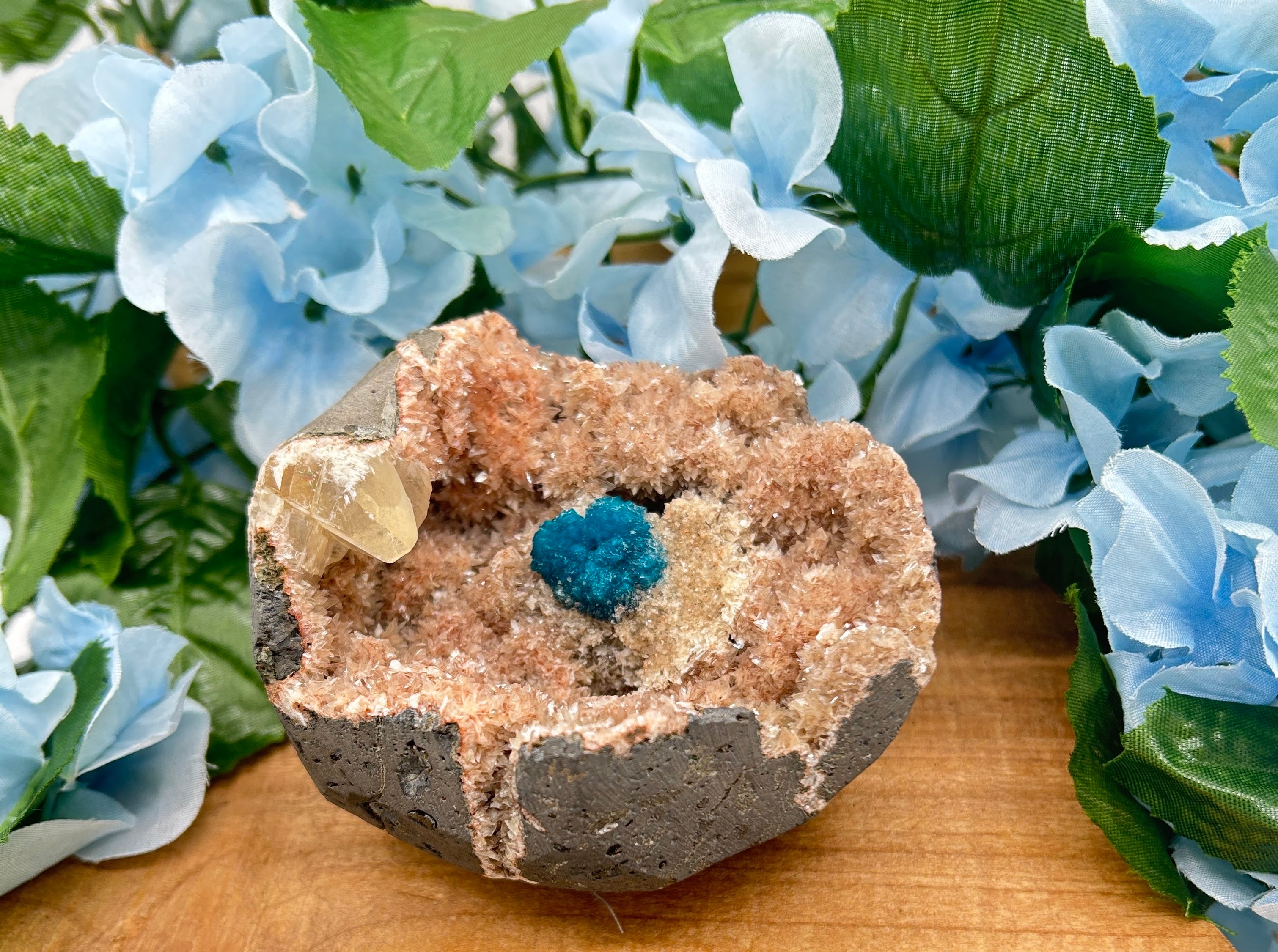 The combination of Cavansite and Stilbite creates a harmonious symphony of color and texture, with the vibrant blue of the Cavansite contrasting beautifully against the soft, peachy tones of the Stilbite.