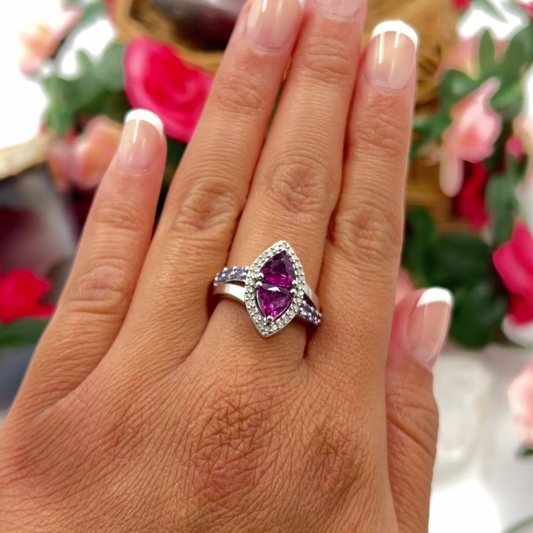 This ring is a true masterpiece, combining the rich, raspberry-red hue of rhodolite garnet, the deep blue-violet of tanzanite, and the sparkling brilliance of diamonds. The filigree design adds a touch of vintage charm, making it a perfect statement piece for any occasion.