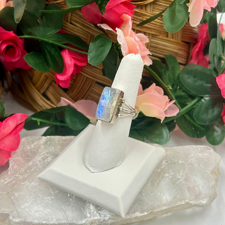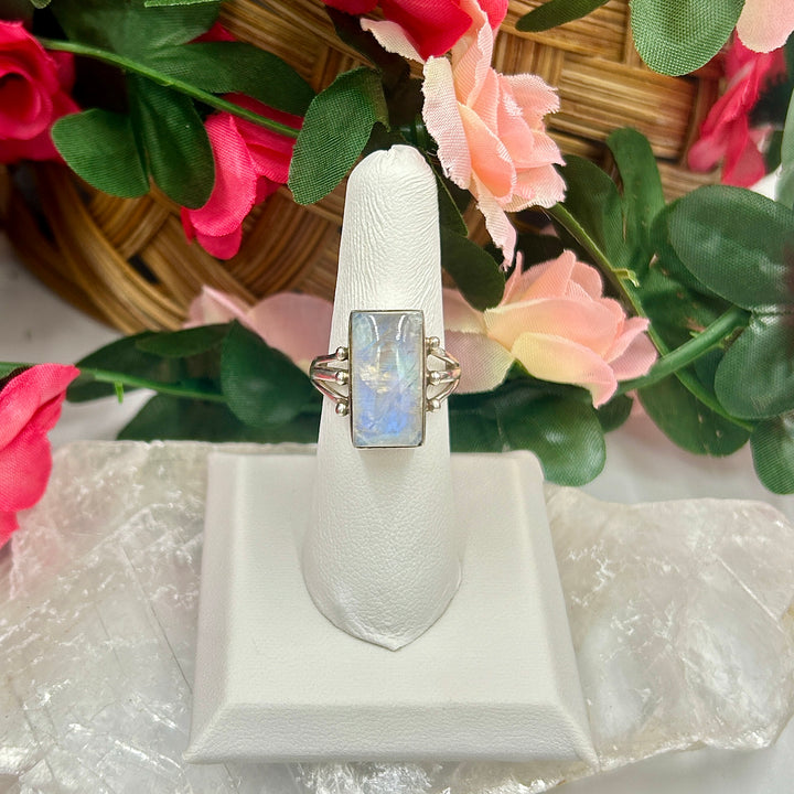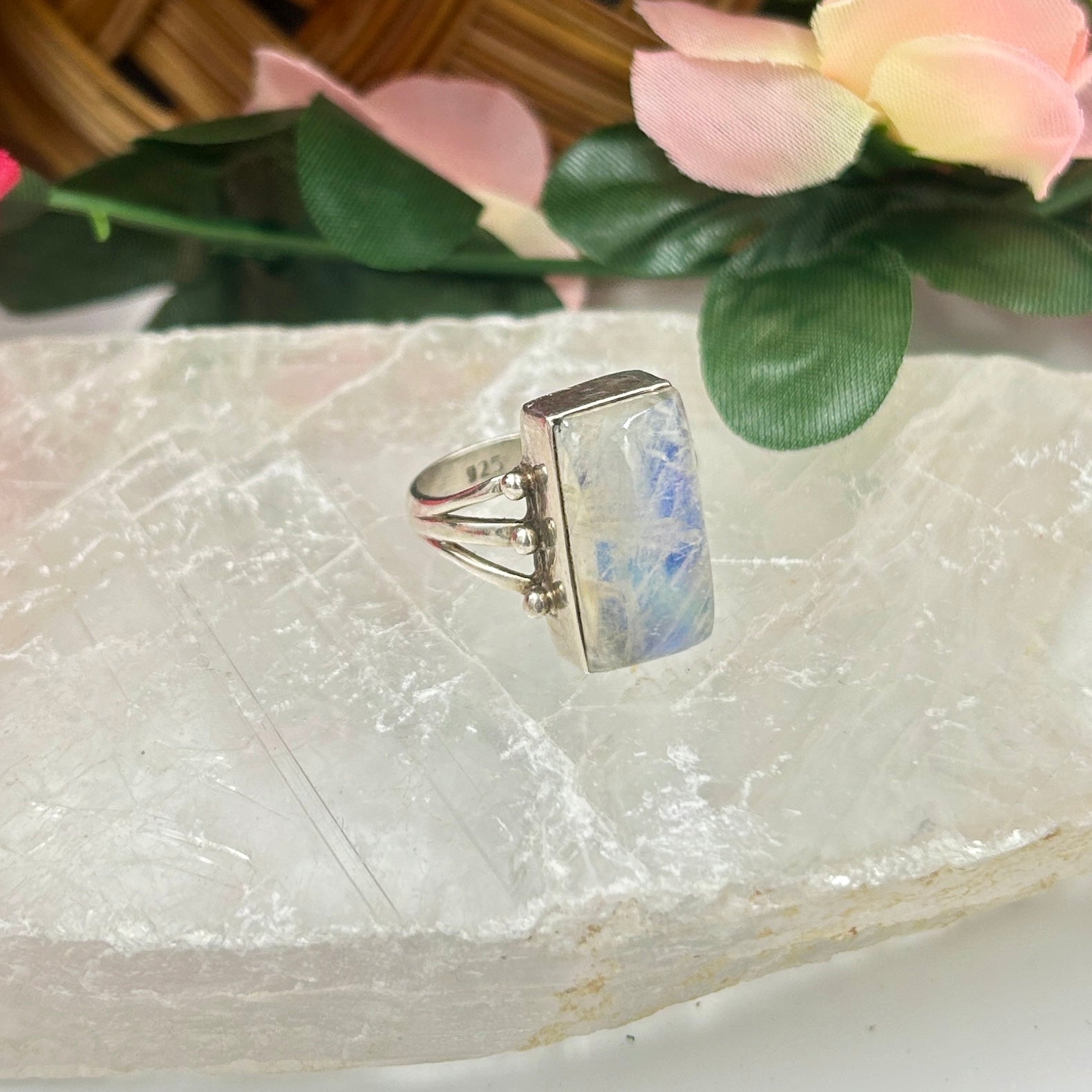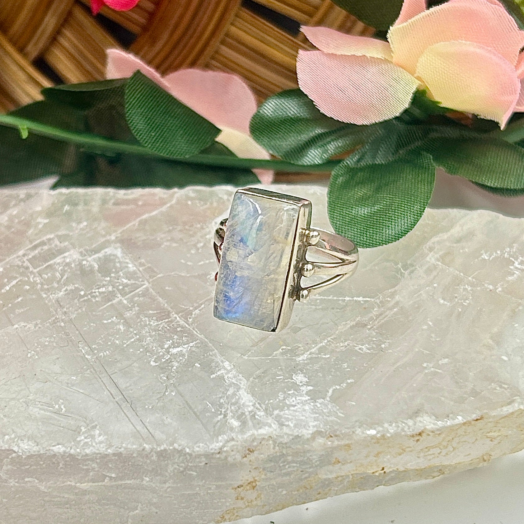 The moonstone, with its enchanting adularescence, is the star of this elegant ring. Its subtle yet captivating glow is beautifully complemented by the sleek sterling silver split band, creating a harmonious blend of classic charm and modern style.