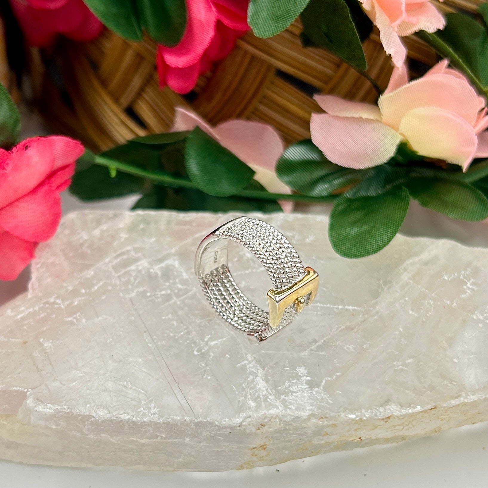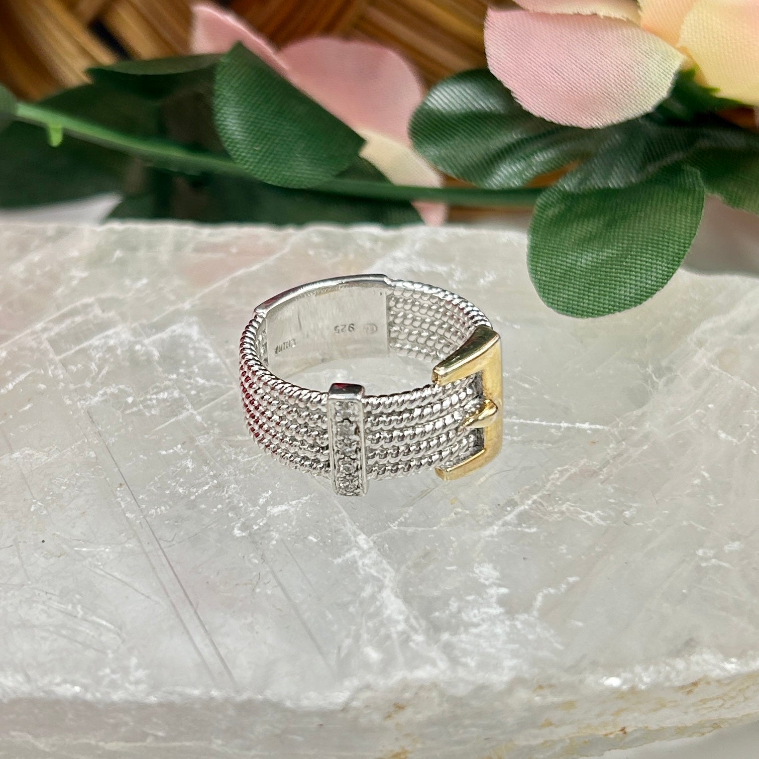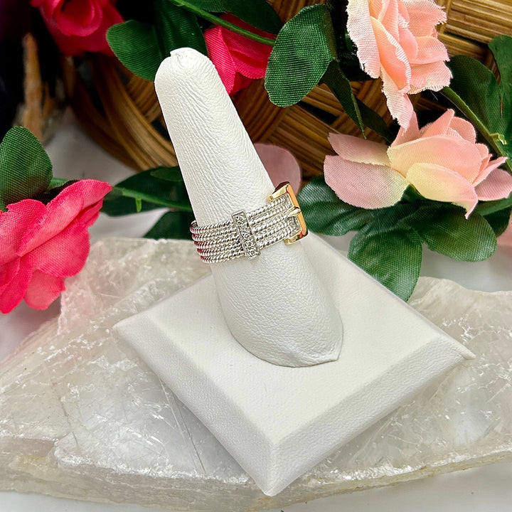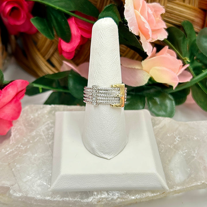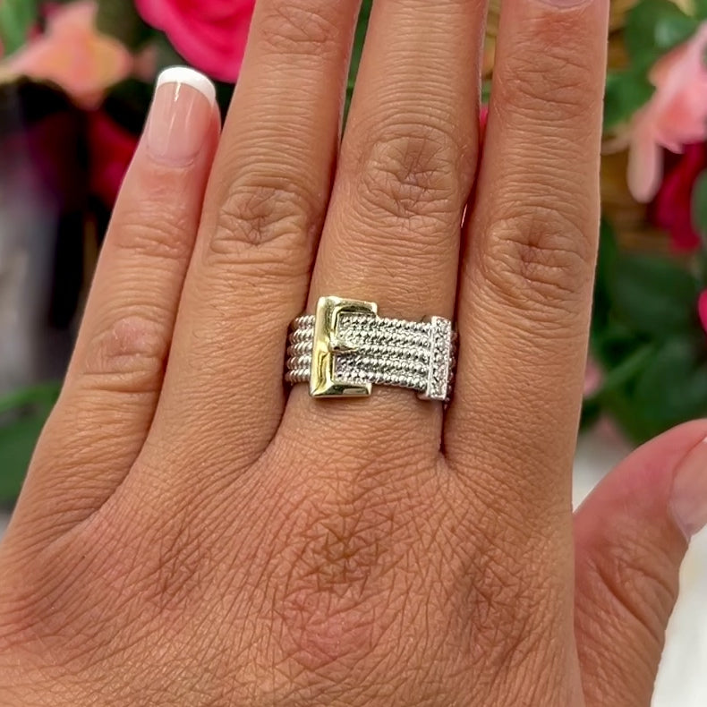 This ring stands out with its detailed cable pattern and sophisticated belt buckle design, making it a perfect accessory for those who appreciate unique and stylish jewelry. The addition of dazzling diamonds adds a touch of luxury, enhancing its overall allure.