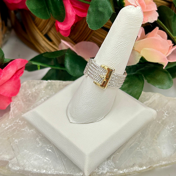 Ideal for both casual and formal occasions, this designer ring is versatile and eye-catching. Whether you're looking to elevate your everyday look or add a special piece to your jewelry collection, our Sterling Silver Designer EA Diamond Cable Belt Buckle Ring is the perfect choice.